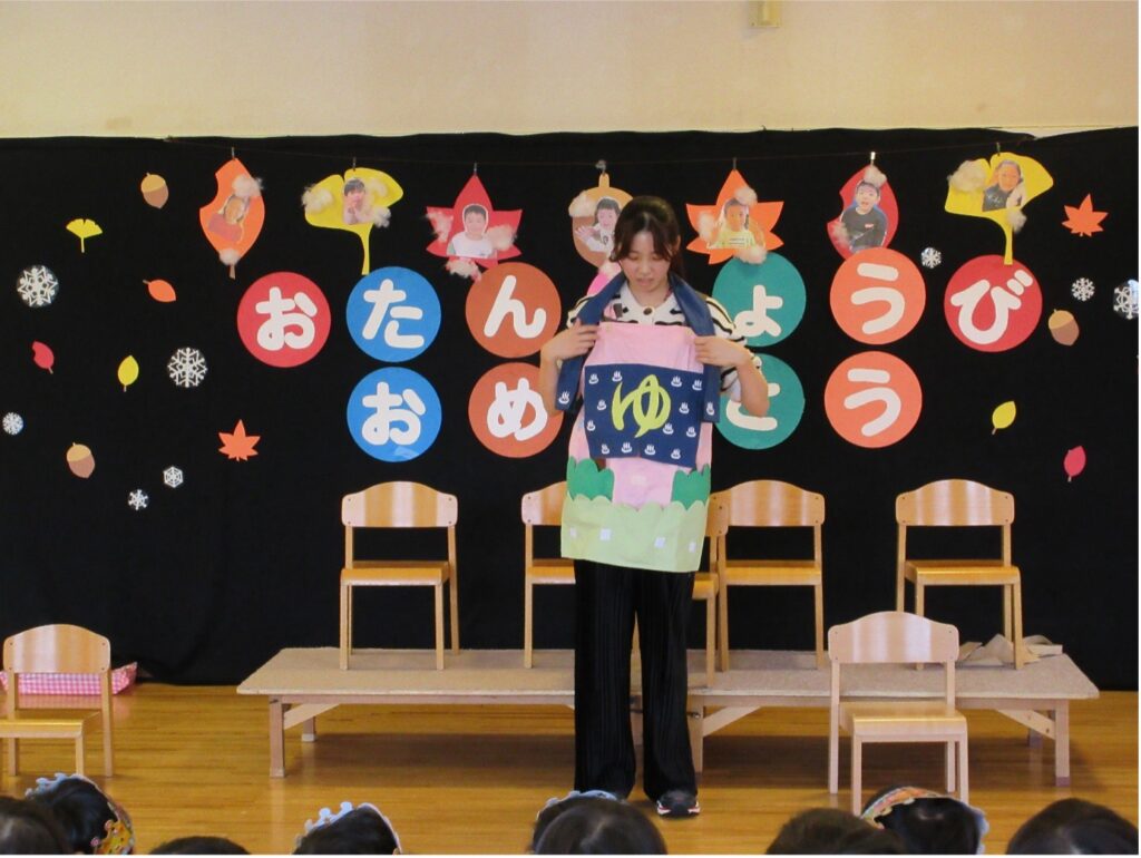 INFO11月のお誕生会を開催しました。2025.12.24今日は11月うまれさんのお誕生会でした。インタビュー前はドキドキしている表情の子もいましたが、しっかりと質問に答えることができていましたよ♪保育士の出し物では「りんごさんはなぜなぜ赤い?」を行いました。皆でゴシゴシりんごやお芋を洗ったり、お風呂に入る数を数えたり…。雪ダルマがお風呂に入り、雪が溶けると中から11月うまれさんが!「わー!」と大喜びの子ども達でした。PREV一覧へ戻る